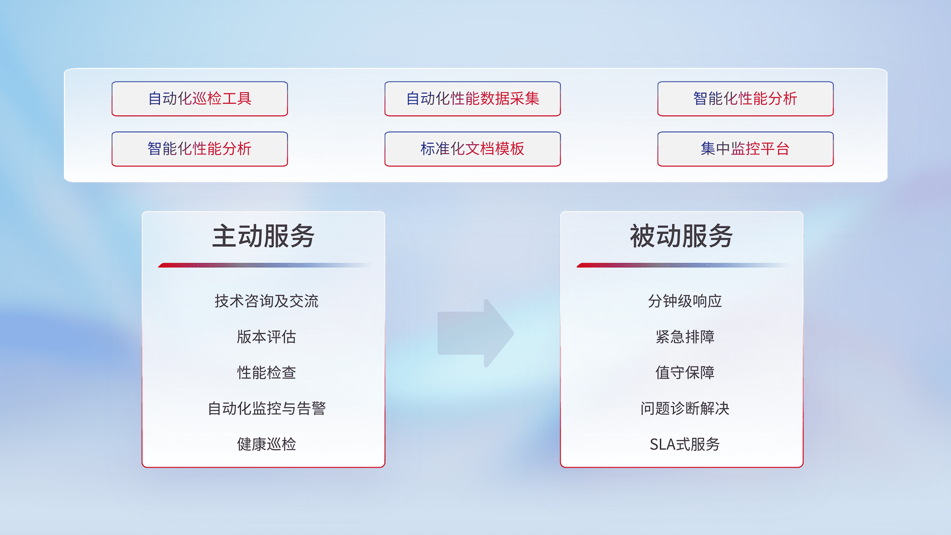 智能化工具和标准化文档,,,,保障服务质量,,,提供主动服务(包含技术咨询、、版本评估、、性能检查、、、自动化监控与告警、、、、健康巡检)和被动服务包含(分钟级响应、、、紧急排障、、、值守保障、、、问题诊断解决、、、、SLA服务)。。。